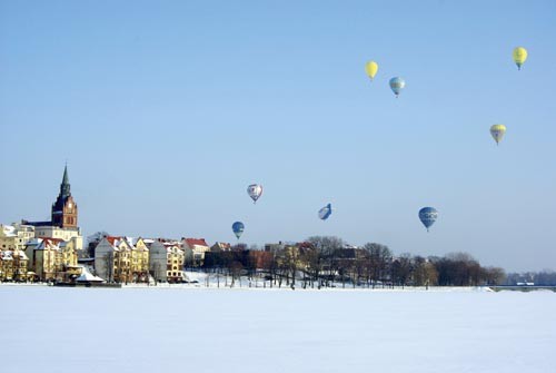 Widok balonów nad Ełkiem już nie dziwi. Ale zimą - to debiut. Nad białą taflą lodu pokrywającego Jezioro Ełckie pojawiło się w zimowym słońcu 21 balonów.