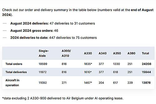 Mimo wakacji i sezonu urlopowego Airbus nie zwolnił znacznie tempa dostaw nowych samolotów (Lipcowe wyniki Airbusa, 2024-08-07). W sierpniu 2024 dostarczył ich 47 dla 31 odbiorców. Były to przede wszystkim A320neo (12) i A321neo (24).