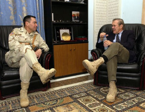 Gen. Ricardo Sanchez rozmawia z sekretarzem obrony Donaldem H. Rumsfeldem w czasie jego wizyty w Bagdadzie, 6 grudnia 2003 / Zdjęcie: USAF