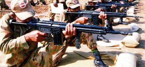 Podstawowym uzbrojeniem indywidualnym armii Pakistanu pozostaje, produkowany od lat 1960. na licencji niemieckiej H&K przez państwowy koncern POF (Pakistan Ordnance Factories) karabin G3 w odmianie G3A3 z kolbą stałą i G3P4 z kolbą wysuwaną (lokalny wariant G3A4). Broń ta zasilana jest silnym energetycznie nabojem karabinowym 7,62 mm x 51.
