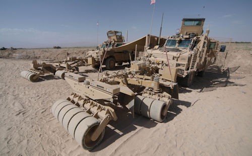 Największe zagrożenie dla żołnierzy stanowią miny-pułapki. Coraz więcej muzułmańskich instruktorów z bogatymi doświadczeniami bojowymi przenika do Afganistanu i szkoli miejscowych bombmakerów. Żołnierze wykorzystują wszelkie sposoby wykrywania i niszczenia min, począwszy od tradycyjnych metod saperskich poprzez sprzęt elektroniczny, roboty do wykrywania, zakłócanie sygnałów, aż po systemy stworzone specjalnie do walki z minami-pułapkami podczas działań asymetrycznych, jak widoczne na zdjęciu trały zespołu RCP ze składu sił amerykańskich. W prowincji Ghazni dowódca regionu miał do dyspozycji 10 takich zespołów. Współpracowały one także z polskimi żołnierzami. Na zdjęciu - podczas operacji w Qarabaghu