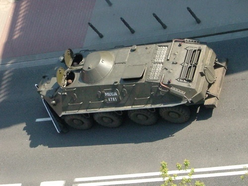 Policyjny transporter opancerzony BTR-60PB 8x8 podczas Europejskiego Szczytu Gospodarczego w Warszawie w 2004. To jedno z ostatnich przypadków wykorzystania tych pojazdów na szerszą skalę. Policja odziedziczyła je po Milicji Obywatelskiej, która otrzymała większość z ZSRR na początku lat 1980. / Zdjęcie: Alina Zienowicz