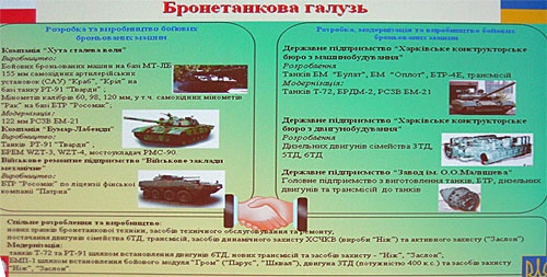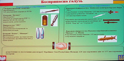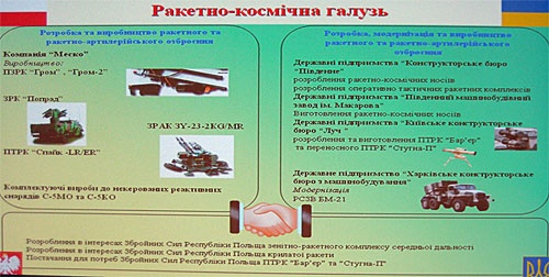 Waldemarowi Skrzypczakowi sekundował dyr. Odnorałow, który podał, że Ukraina oferuje sterowane cyfrowo silniki do śmigłowców rodziny Mi-8, Mi-17 i Mi-24 nowej generacji. Poinformował, że podczas prób jedna z wyposażonych w taki silnik maszyn osiągnęła rekordowy pułap 8160 m. Strona ukraińska jest z kolei zainteresowana polskimi hełmami z wyświetlaczami i goglami noktowizyjnymi. Odnorałow zaoferował dla wszelkiego typu polskich pojazdów pancernych płaskie diesle rodziny 3TD, 5TD i 6TD wraz z układami transmisji mocy z charkowskiego centrum imienia Małyszewa.